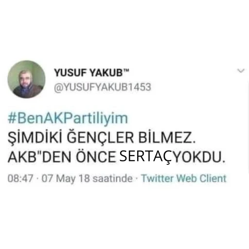 YUSUF YAKUB™ @YUSUFYAKUB1453 #BenAKPartiliyim ŞİMDİKİ ĞENÇLER BİLMEZ. AKB"DEN ÖNCE SERTAÇYOKDU. 08:47 07 May 18 saatinde Twitter Web Client