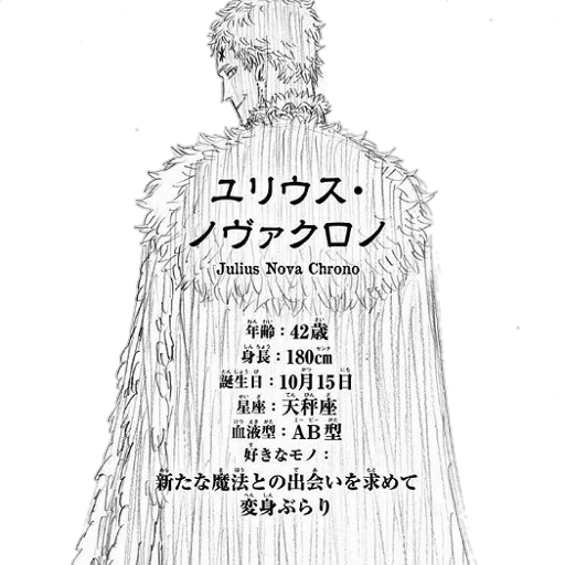 ユリウス・ ノヴァクロノ Julius Nova Chrono 年齢: 42歳 じんちょう +27 身長: 180cm # BALESU 誕生日 10月15日 TA DA 星座:天秤座 ME 1-E-PE 血液型 AB型 好きなモノ: 新たな魔法との出会いを求めて 変身ぶらり