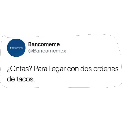 Bancomeme B Bancomeme @Bancomemex ¿Ontas? Para llegar con dos ordenes de tacos.