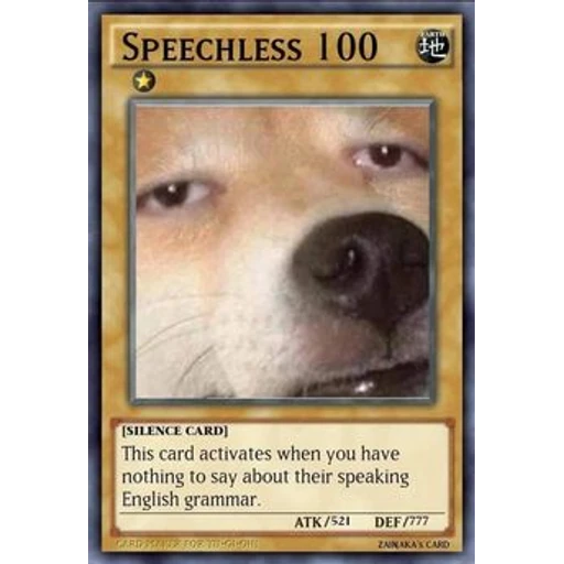SPEECHLESS 100 [SILENCE CARD] This card activates when you have nothing to say about their speaking English grammar. CARD SAVE FOR TITE-GI-OHS ATK/521 PARTIA #th DEF/777 ZAINAKA'S CARD
