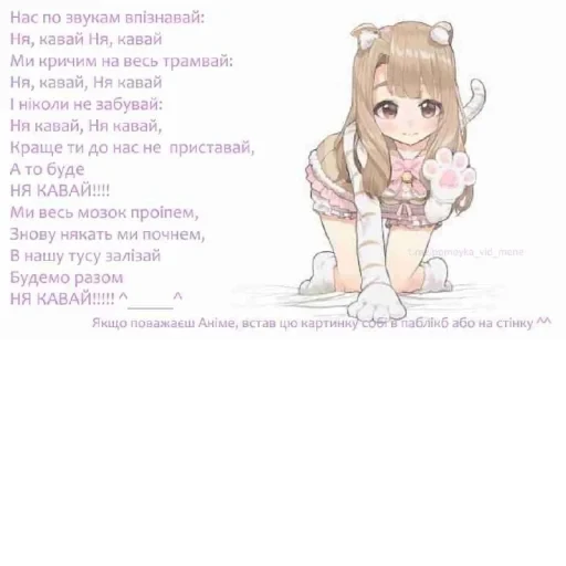 Нас по звукам впізнавай: Ня, кавай Ня, кавай Ми кричим на весь трамвай: Ня, кавай, Ня кавай І ніколи не забувай: Ня кавай, Ня кавай, Краще ти до нас не приставай, А то буде НЯ КАВАЙ!!!! Ми весь мозок проіпем, Знову някать ми почнем, В нашу тусу залізай Будемо разом НЯ КАВАЙ!!!!! А tomoyka vid mene Якщо поважаєш Аніме, встав цю картинку собі в паблікб або на стінку M