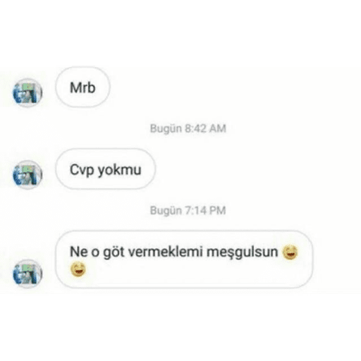 Mrb Cvp yokmu Bugün 8:42 AM Bugün 7:14 PM Ne o göt vermeklemi meşgulsun